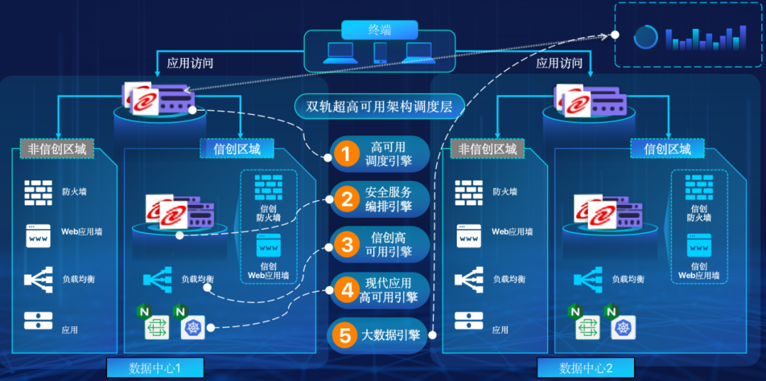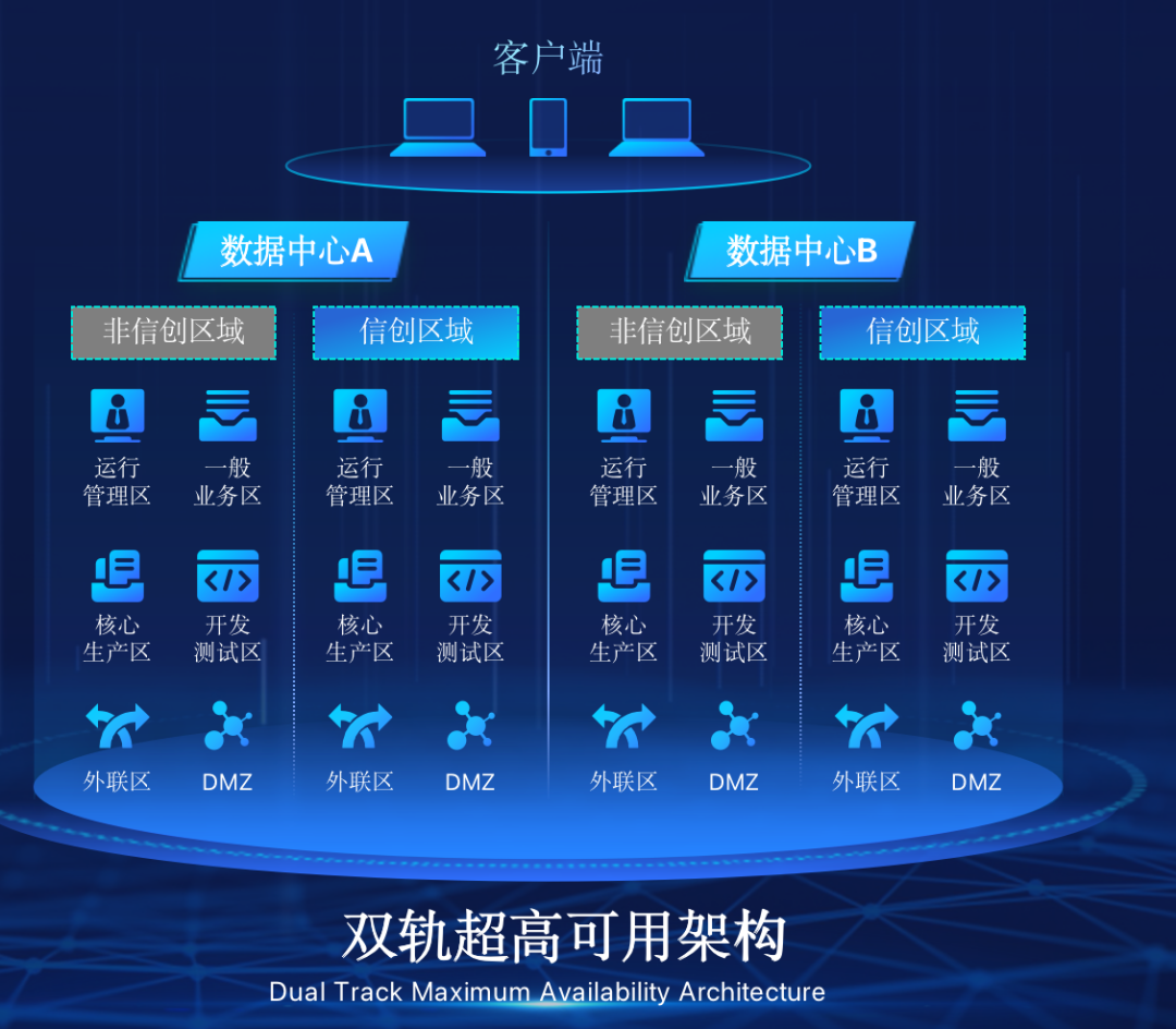 yl7703永利在企业面临自主创新IT基础重构过程中,推出的全新架构双轨超高可用架构(简称DTMAA),在双活数据中心的分区调度基础上,添加每个数据中心内信创域和非信创域的分域调度,来实现分区分域协同的多活双轨超高可用。