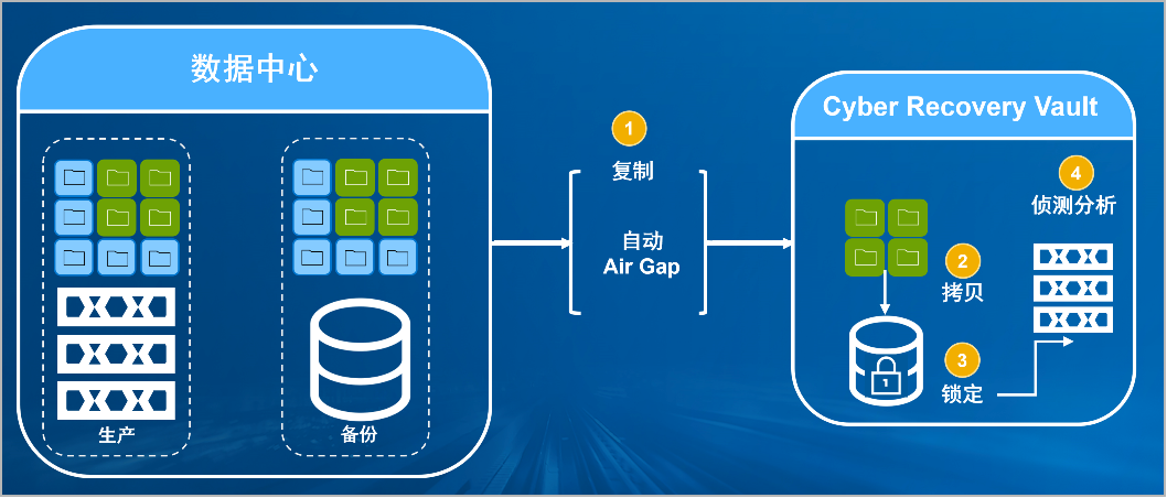 yl7703永利防勒索病毒方案将生产中心备份数据复制到Vault区,复制后网络自动断开实现弹性隔离。Vault区的数据快速拷贝,并对拷贝版本加锁(在锁定期数据不允许删除和修改)。Vault沙箱内对拷贝版本进行扫描分析,验证数据是否完好。